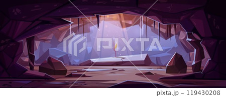 Fantastic cavern background. Cartoon cave with stalactites and spotlight copy space for text.