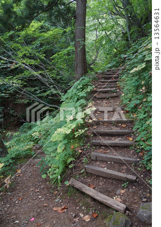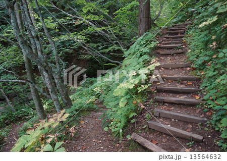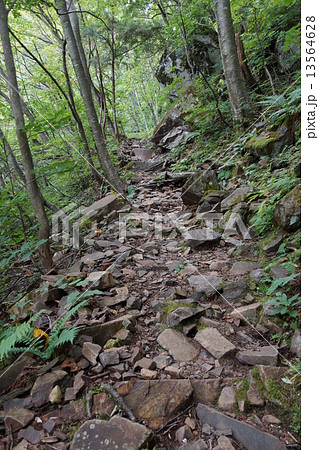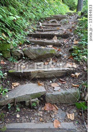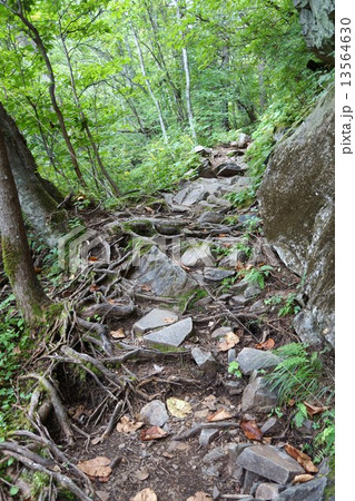 苔むす原生林と岩道の登山道(長野・蓼科山)/Mossy Forest Trail with Rock