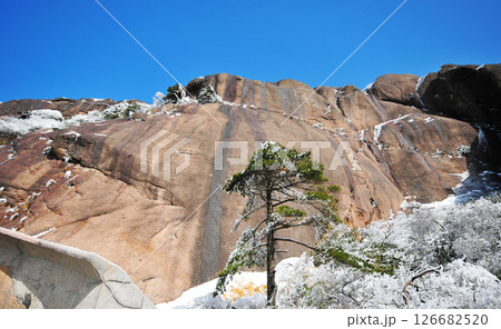 Mountain landscape after heavy snowfall, trees covered with snow and rime, China, Anhui Province, Mount Huang