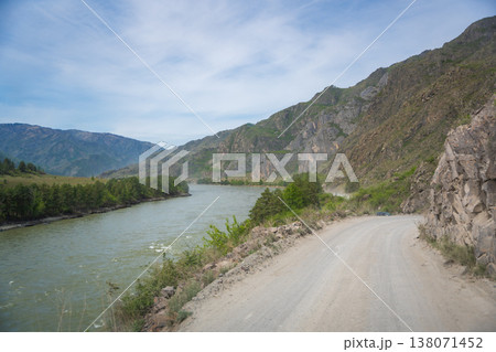 Mountain road running along the Katun river in Altai Russia. Scenic route winding through natural landscapes of the Altai mountains.