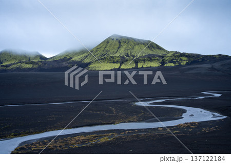 Rugged volcanic landscape with black sand and glacial river streaming through, Highlands, Iceland