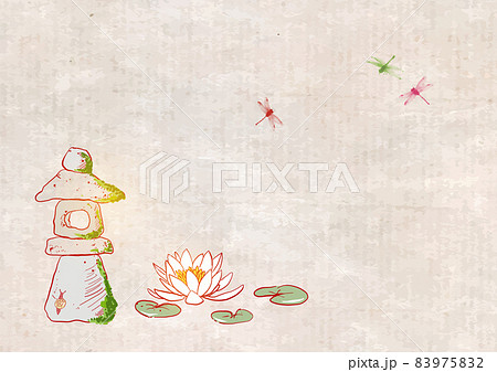 Toro stone lantern, lotus flower and dragonflies on vintage background. Japansese zen garden composition