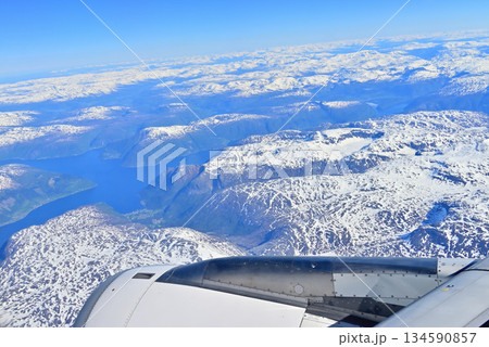 ベルゲン空港への機上からフィクセスンドフィヨルドの眺め