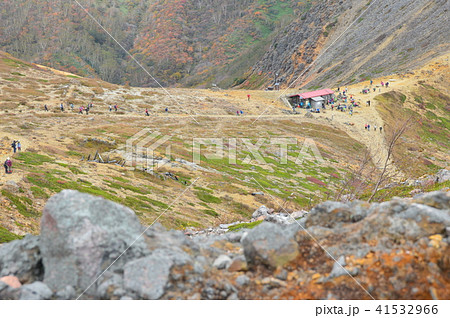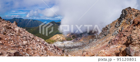 秋の栃木県那須岳の峰の茶屋跡と剣が峰方面の眺望