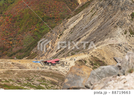 秋の栃木県那須岳の峰の茶屋避難小屋付近から北西側下の那須岳避難小屋方面を見る
