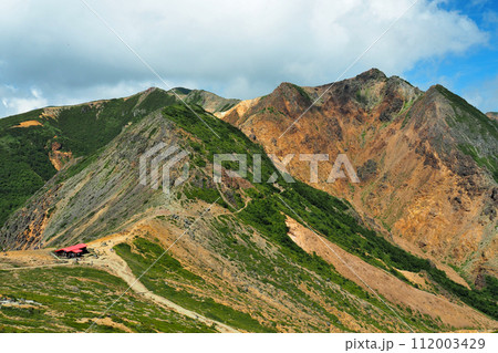 那須・茶臼岳の登山道から臨む朝日岳と峰の茶屋跡避難小屋