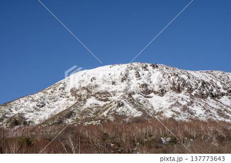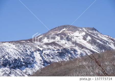 青空に映える残雪の那須連山・茶臼岳の冬景色(栃木県那須町)