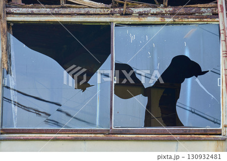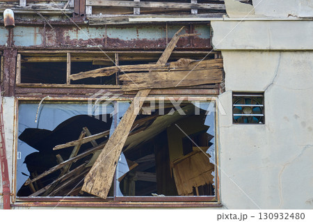 ひび割れた外壁と曇りガラスの窓|時の流れを感じる古い建物の外観