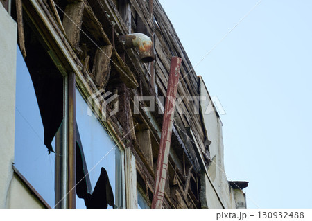 Opened, destroyed facade of a commercial modern building to be reconstructed.