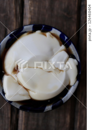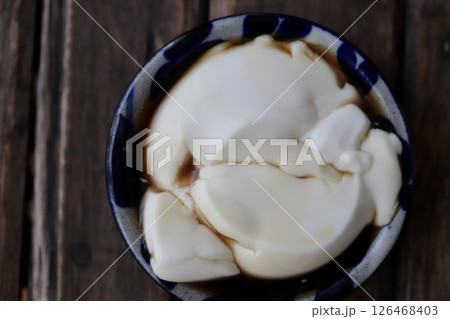 やちむんの豆皿に入れた崩れたジーマーミ豆腐