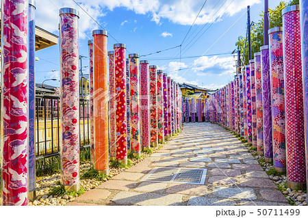 嵐電嵐山駅の風景 キモノフォレストと電車 京都市右京区