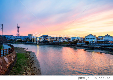 Japanese riverbank houses along Matsuura river at dusk, Saga, Japan
