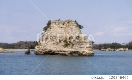 嵯峨渓の軍艦島。奥松島の源田浜から見る奇岩の島。宮城県東松島市宮戸。