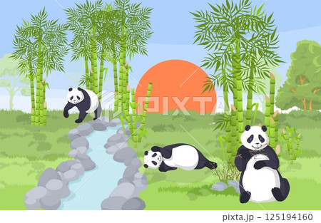 Panda bears are seen relaxing and playing in a lush bamboo forest during the evening. A picturesque sunset adds a warm glow to the serene landscape, enhancing the natural beauty