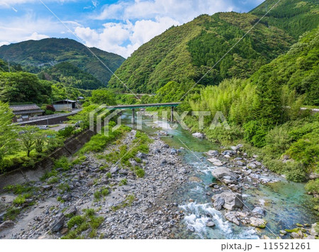 田舎の夏休み、涼し気な川原の風景。高知県吾川郡いの町。ドローン空撮