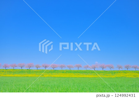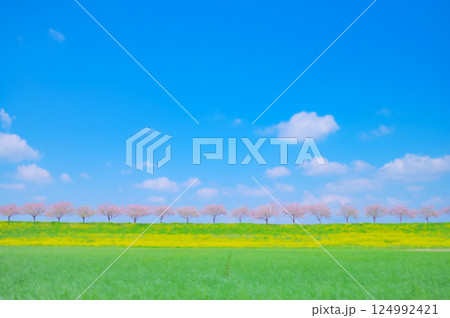 春風にゆれる思川桜と青空の風景