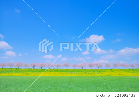 ツクシと桜並木(三刀屋川河川敷の桜並木:雲南市)