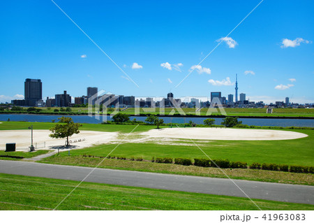 荒川・扇河川健康公園パークゴルフ場と東京スカイツリー