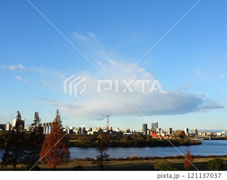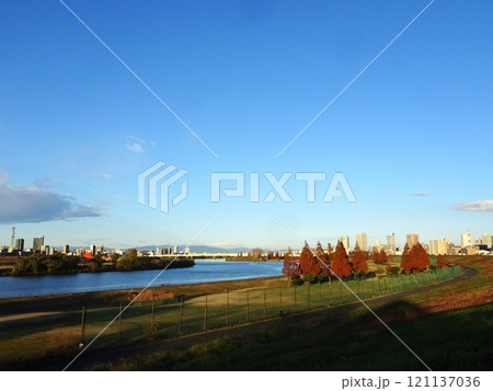 武庫川べりの柔らかな日差しと紅葉、11月8日、宝塚市、日本
