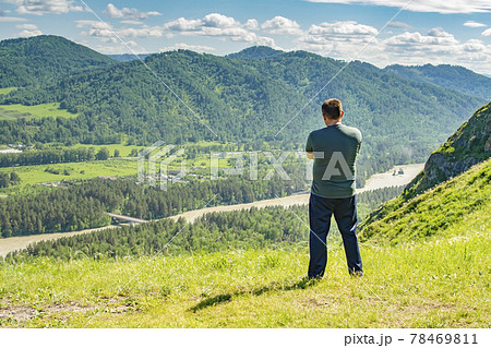 a man stands on the top of a mountain and looks thoughtfully at a mountain valley with a river
