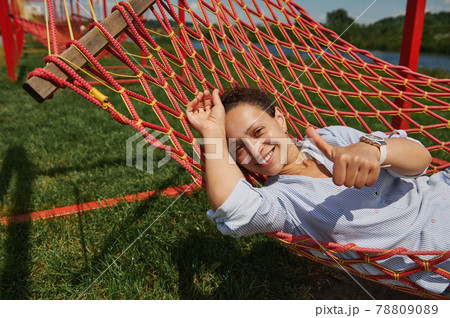 Happy woman lying in a hammock smiling cutely at the camera and showing a thumb up on the background of the river bank