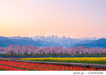 【富山県】あさひ舟川 春の四重奏(満開の桜とチューリップと菜の花と北アルプス)
