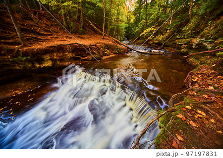 River with fallen log and waterfall with exposed tree roots in it