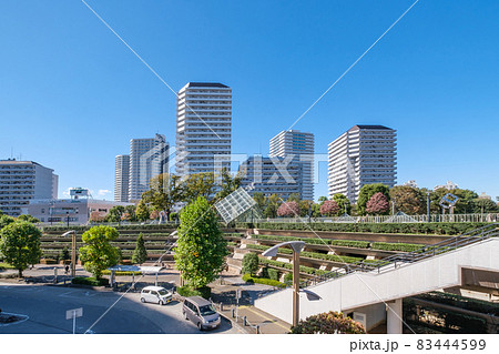 秋晴れの川口西口公園とタワーマンション群 埼玉県川口市