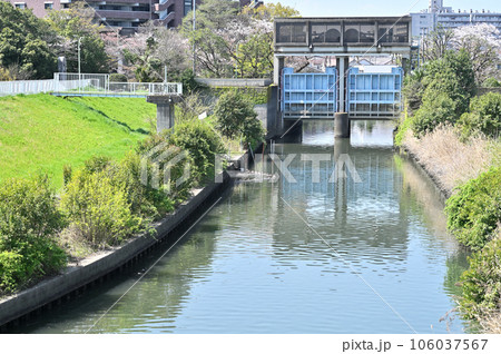 埼玉県川口市の芝川にかかる「ふれあい橋」の風景