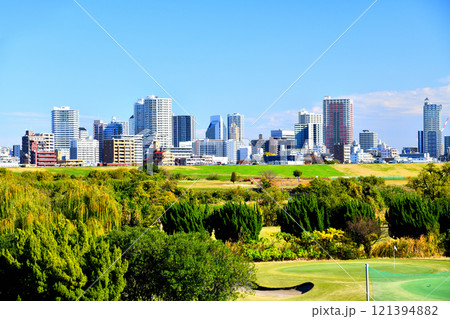 「埼玉県」荒川河川敷から川口市のビル群を望む