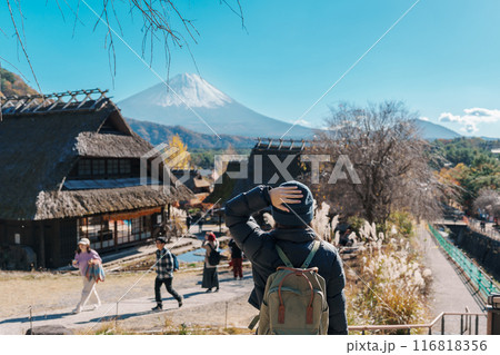 Woman tourist with mount Fuji at Saiko Iyashino Sato Nenba in Autumn season, happy Traveler travel Mt Fuji, Yamanashi, Japan. Landmark for tourist attraction. Japan Travel, Destination and Vacation