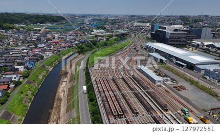 横浜地下鉄グリーンラインの川和車両基地(空撮) - 横浜市都筑区,日本