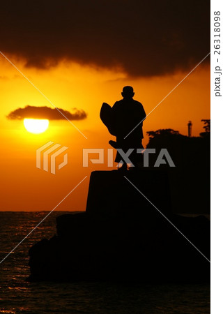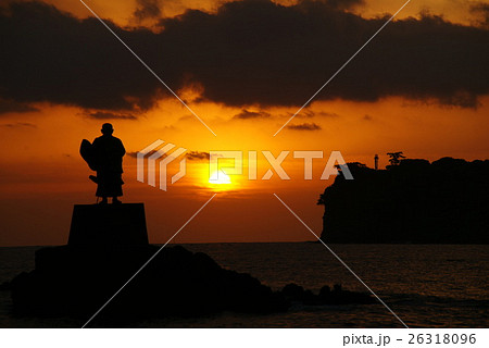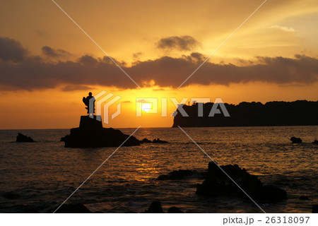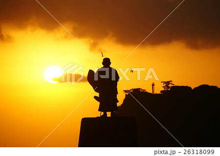 川奈岬の日蓮聖人像に朝陽