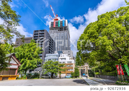 日本の川崎都市景観 緑に包まれた川崎の稲毛神社から川崎市新本庁舎の新築工事などを望む