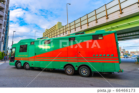 日本の川崎都市景観「競馬場前」の交差点を走る馬運車(奥は川崎競馬場)