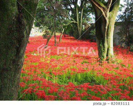 樹木のした見事に咲き誇る彼岸花の写真。「岡山県真庭市・川東公園」