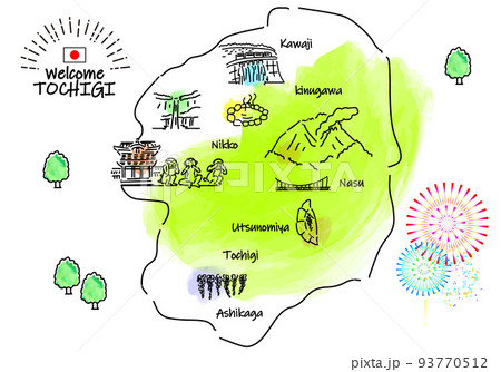 手描きの栃木県の観光地のシンプル線画イラストマップ