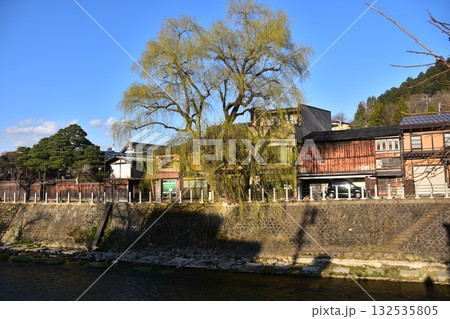 日本の岐阜県の高山市 春の高山祭期間中 観光名所の中橋周辺の街並み 美しい青空と古民家と柳の木