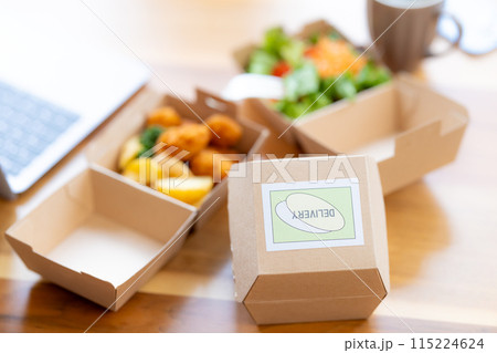 パソコンを見ながらデリバリーで注文した料理を食べる男性
