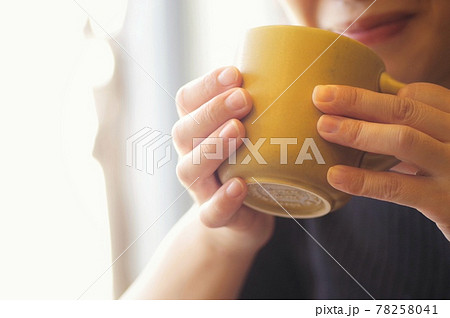 マグカップで飲み物を飲む女性