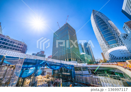 日本の東京都市景観2月21日。新宿駅西口再開発や西新宿一丁目地区プロジェクト、クレーンなどを望む
