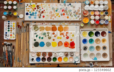 neatly organized set of paintbrushes and color palettes, variety of vibrant shades and essential tools for creative expression in painting, simplicity and organized artistic creativity