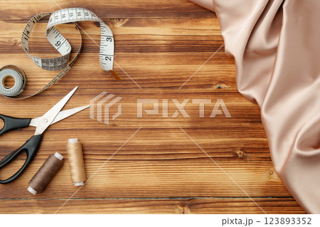 Crafting tools and materials arranged on a wooden table for sewing projects
