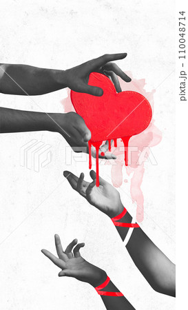 Poster. Contemporary art collage. Male hands in hold red heart from which red paint drips and give it to female hands in monochrome filter as sign of devotion.