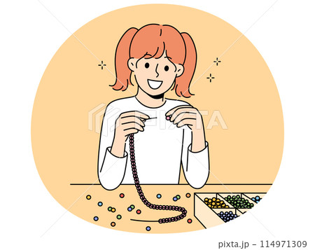 Little girl weaves beaded jewelry sitting at table and creating handmade necklace or bracelet