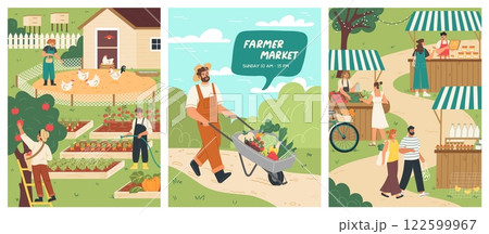 Local farmers gather to offer fresh fruits, vegetables, and handmade goods at the lively farmer market, inviting the community to enjoy a wholesome shopping experience. Vector set.