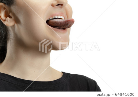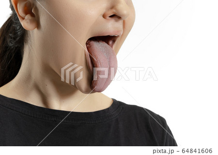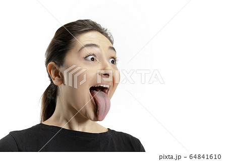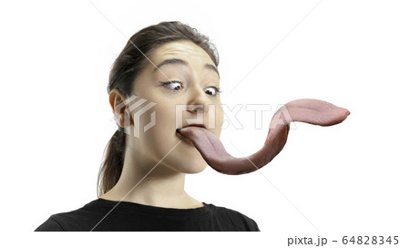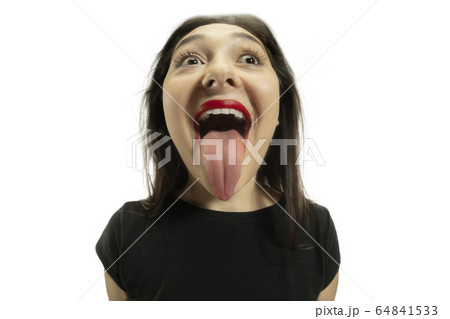 Smiling girl opening her mouth and showing the long big giant tongue isolated on white background, crazy and attracted