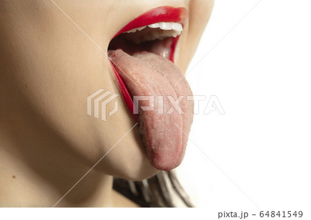 Smiling girl opening her mouth with red lips and showing the long big giant tongue isolated on white background, crazy and attracted, close up