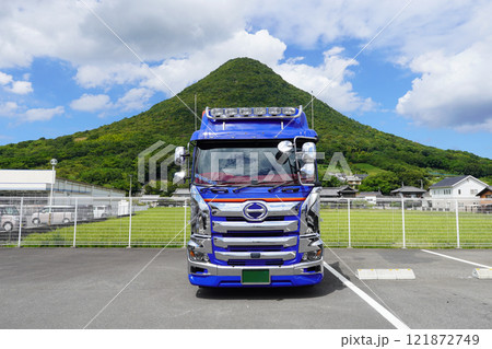 大型トラックの奥に讃岐富士こと飯野山(香川県丸亀市)