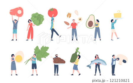 People holding giant food. Keto diet products, eggs meat vegetables. Women men eating fresh ingredients. Grocery store or market recent vector characters